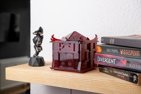 A product from the limited edition collection - “Force of Elements”. The puzzle is made of red plexiglass and stores a piece of the force of elements amulet – fire in its secret compartment. To get to it, you need to solve all the puzzles and melt the Dragon’s heart. Riddles and traps are located on all sides of the escape room box.