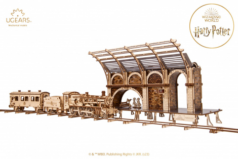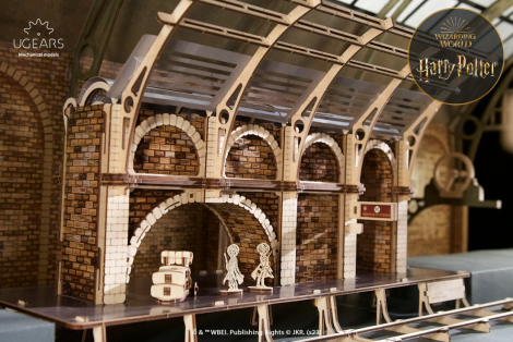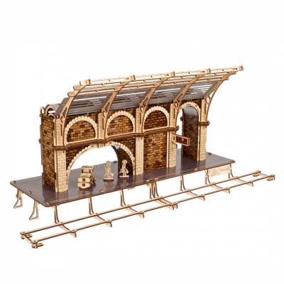 The enchanting wooden model Platform 9 ¾ by Ugears is a new addition to the Ugears Harry Potter™ collection (also featuring DIY wooden mechanical models of the Hogwarts™ Express, Flying Ford Anglia™, Knight Bus™, Hagrid's Flying Motorbike™ and Advent Calendar). This attractive train platform model is a static display that replicates the Victorian era look of King's Cross station with its beautiful brickwork and ceiling arch. The model includes a two-sided platform with upward curving arches, platform sign, a section of track, and two figurines of Harry and Ron with luggage trolley and suitcases loaded with their school things. Detailed decorative cardboard walls complete the realistic design look of the historic station, with added touches of dark mystery, like a cobweb and rat (Scabbers—is that you?).