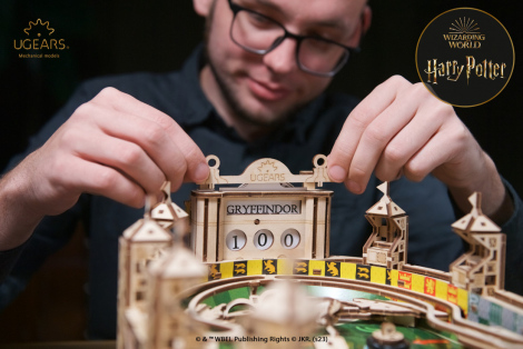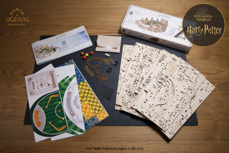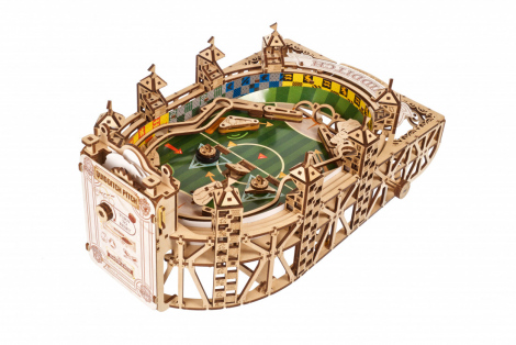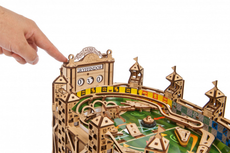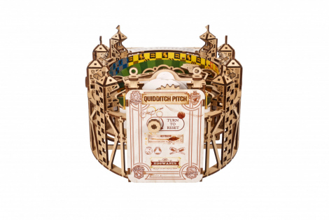 The DIY Ugears Quidditch™ Pinball model is a visually-stunning stadium, comprising a playing field made of cardboard printed with decorative elements, 8 elevated viewing platforms engraved with the logos of the four houses of Hogwarts™ (Gryffindor™, Hufflepuff™, Ravenclaw™ and Sytherin™), functional scoreboard, a chest for storing the Golden Snitch™ and three Quaffle™ balls, and functional pinball game elements including flippers, bumpers, targets and obstacles.