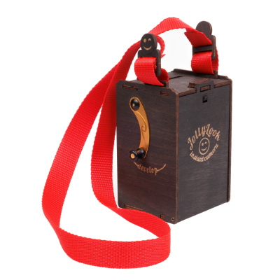Látkový remienok na krk pre fotoaparáty Jollylook v červenej farbe. Dodáva sa s dvoma farebnými možnosťami zámku: morená hnedá a prírodné drevo.